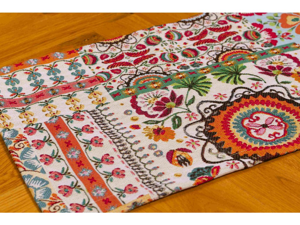 Die Stoffe für die Tischsets sind gewebt mit einer Jacquardtechnologie, bedrückt mit rotations- oder digitalem Aufdruck. Die Stoffe mit Zugabe von Polyester sind weniger anfällig für Falten.